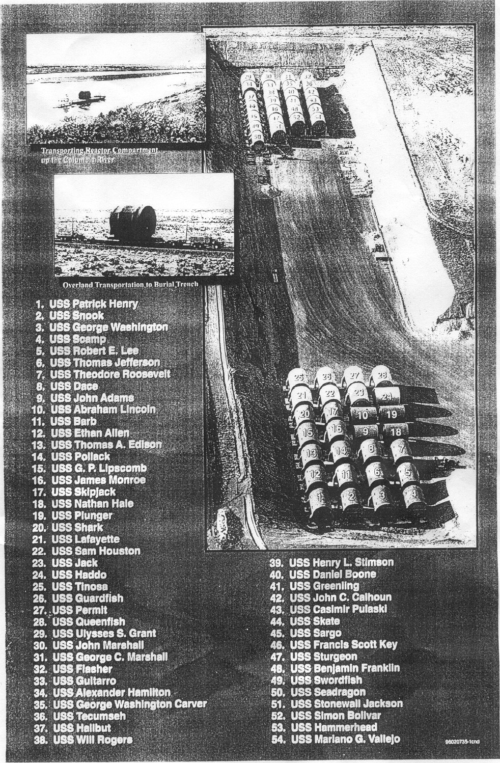 The USS Robert E. Lee's reactor now lies buried in the trench at Hanford. The Hanford Site occupies 560 square miles of south central Washington desert. The reactor compartments are placed in a large open pit in the 200 East area of the Site, which is on a plateau about seven miles from the Columbia River. Eventually, the pit will be covered with dirt. As you can see, a large number of submarine reactor compartments are already there. The Lee's reactor is Numbered as #5 in photo above, or the last one shown on the right of row #2 (counting from the bottom). |