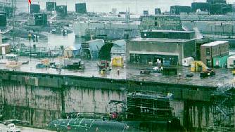 The USS Navy's Polaris Program ended in January 1982 as the last of 16 A3 missiles were off loaded from the USS Robert E. Lee (SSBN-601) inside the Explosive Handling Wharf, US Submarine Base, WA. Photo Submitted by: Allan Dodd and Brian Somers, long time friends & clients of Tim VeArd. Alan & Brian live in Sydney, Australia and are managers of Lowe's Mens Ware (a large retail chain of 120+ stores that uses programs written by Tim). Brian found this photo in a book entitled "Submarine Command" a history of the British Submarine Service written by Reginald Longstaff 1984. At the Nassau Agreement of 1962, President John F. Kennedy agreed that the British navy would deploy 4 SSBNs by 1968. These boats were built in the UK using US Navy weapons systems, equipment and other designs. The US also supplied the A3 missiles and the UK built their own warheads. |